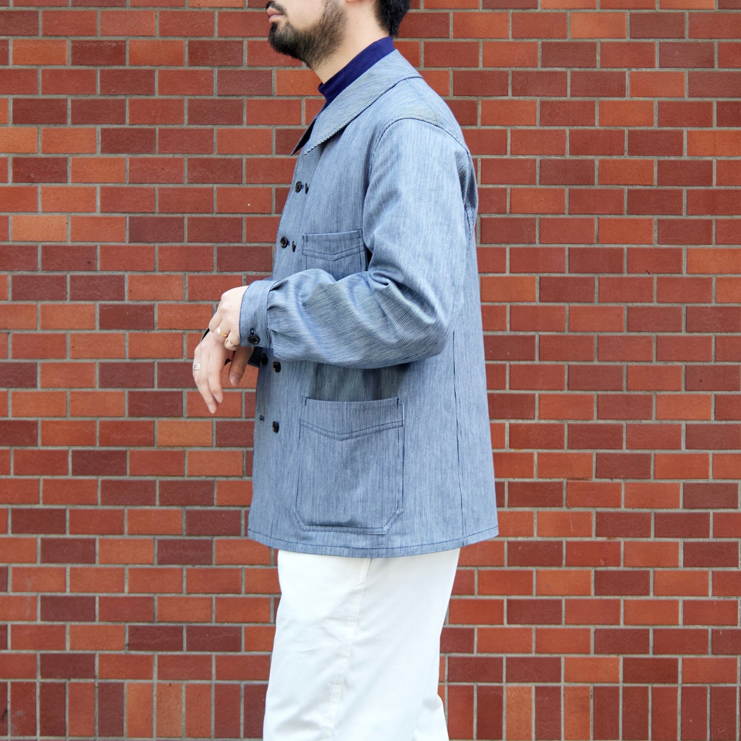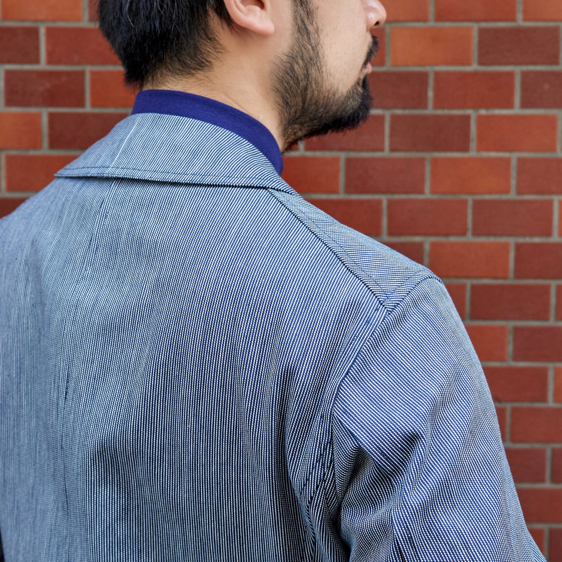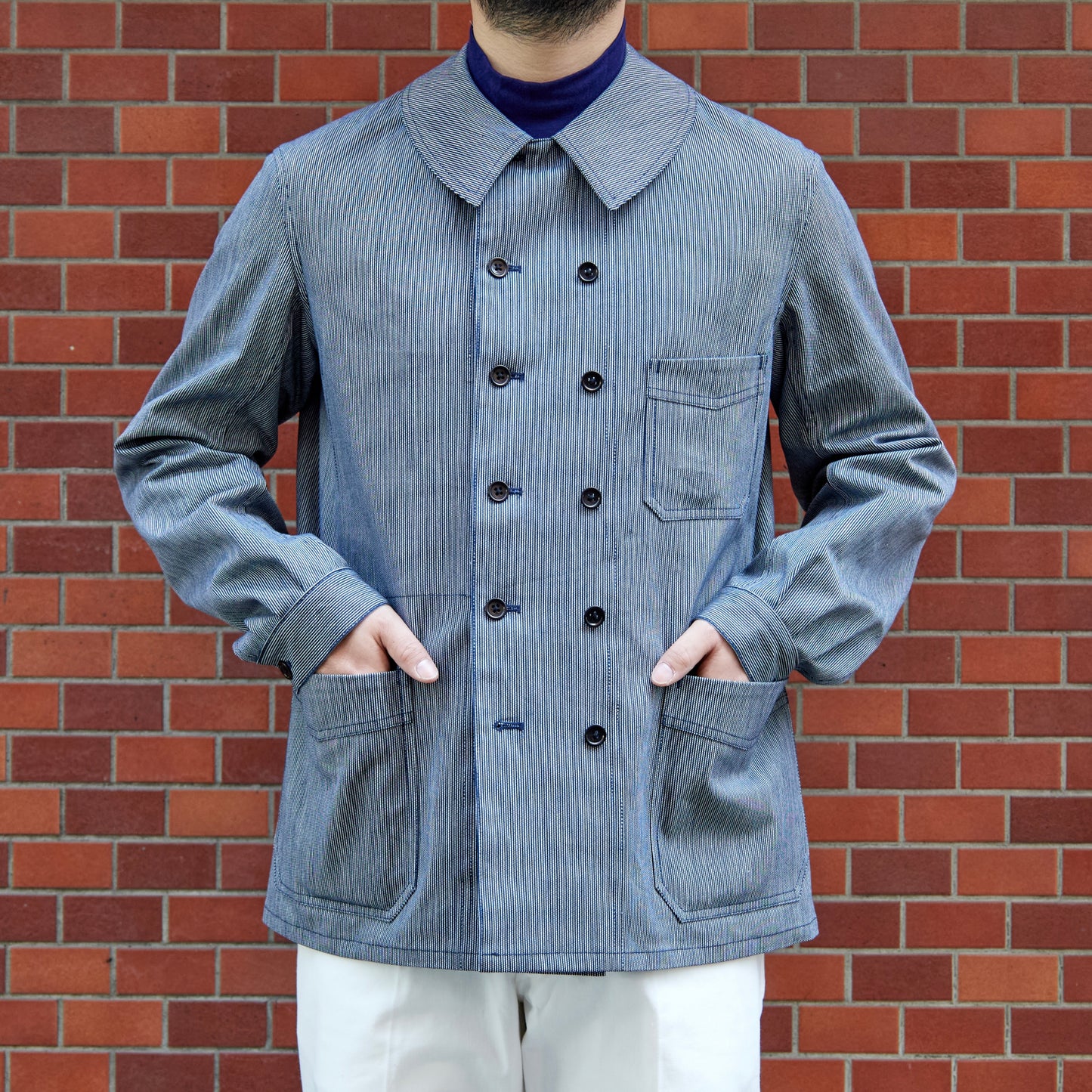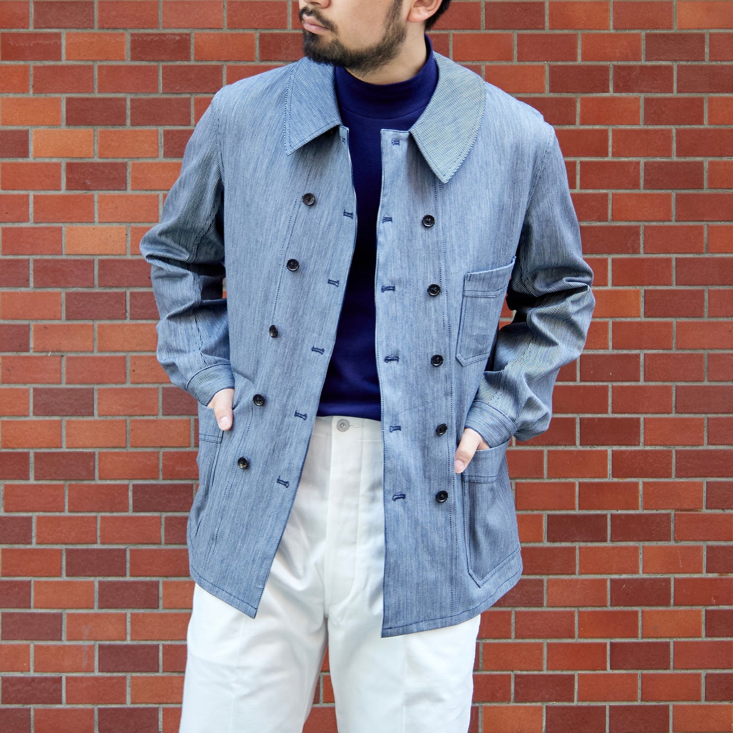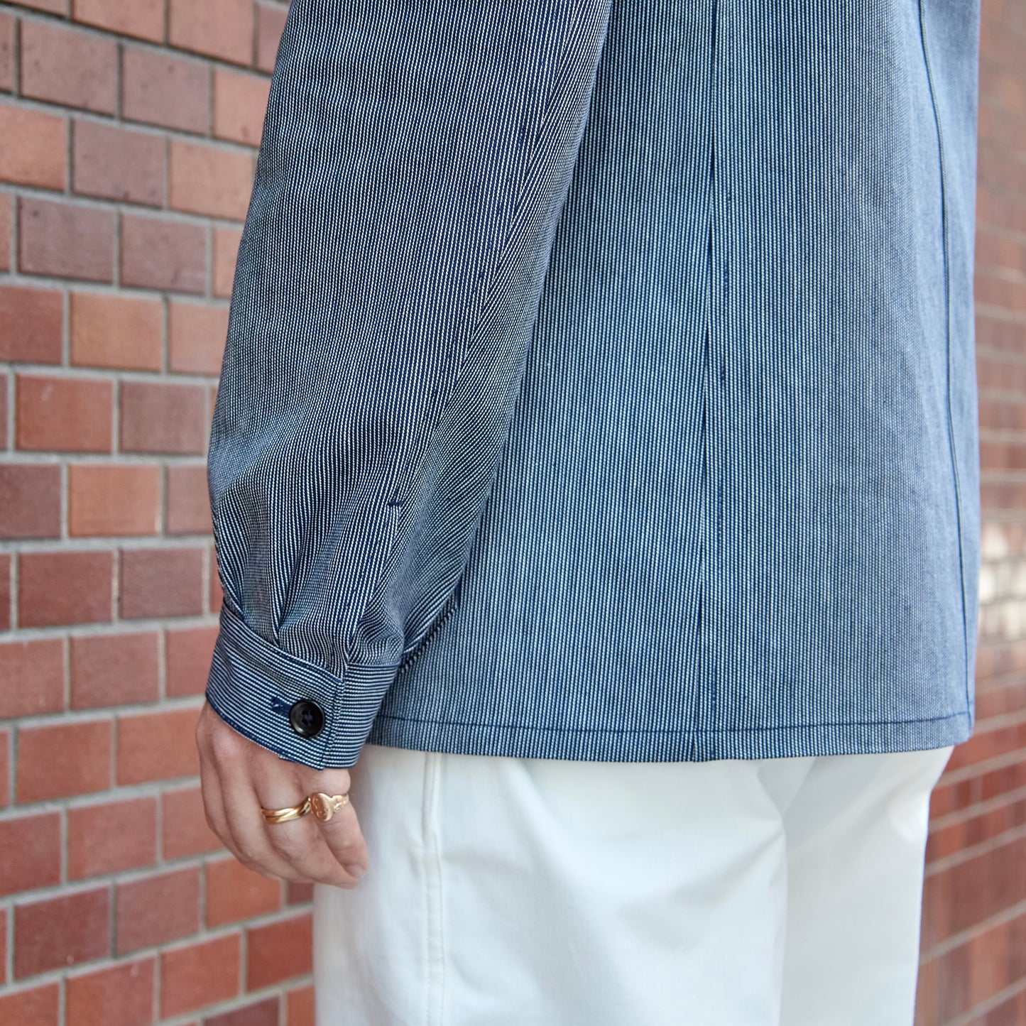 - Made of indigo-dyed striped fabric.